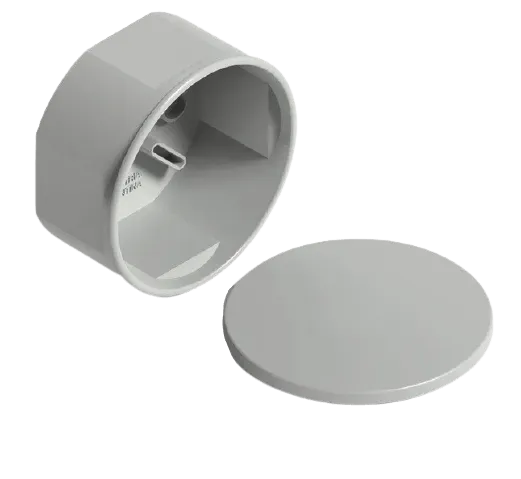 Caja de derivación redonda de PVC gris, con tapa y tapones._x000D_