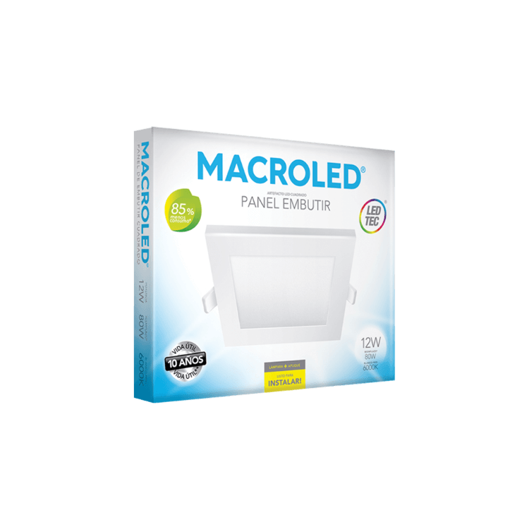 Panel LED de embutir cuadrado blanco 12W. Sin parpadeos, ecológico y con baja emisión de calor.