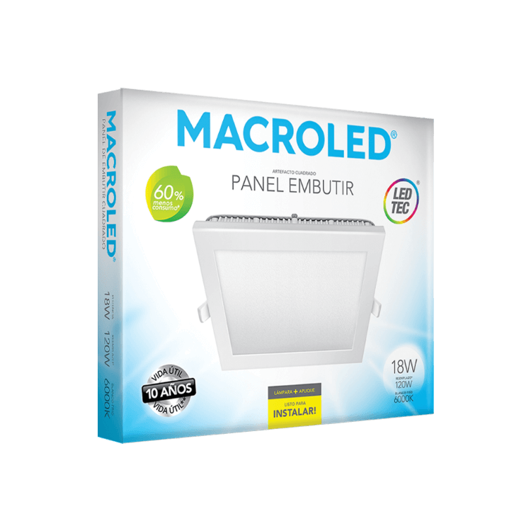 Panel LED de embutir cuadrado blanco 18W. Sin parpadeos, ecológico y con baja emisión de calor.