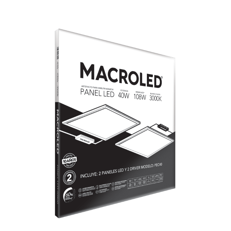 Panel LED de embutir cuadrado blanco 60×60 40W. Sin parpadeos, ecológico y con baja emisión de calor.