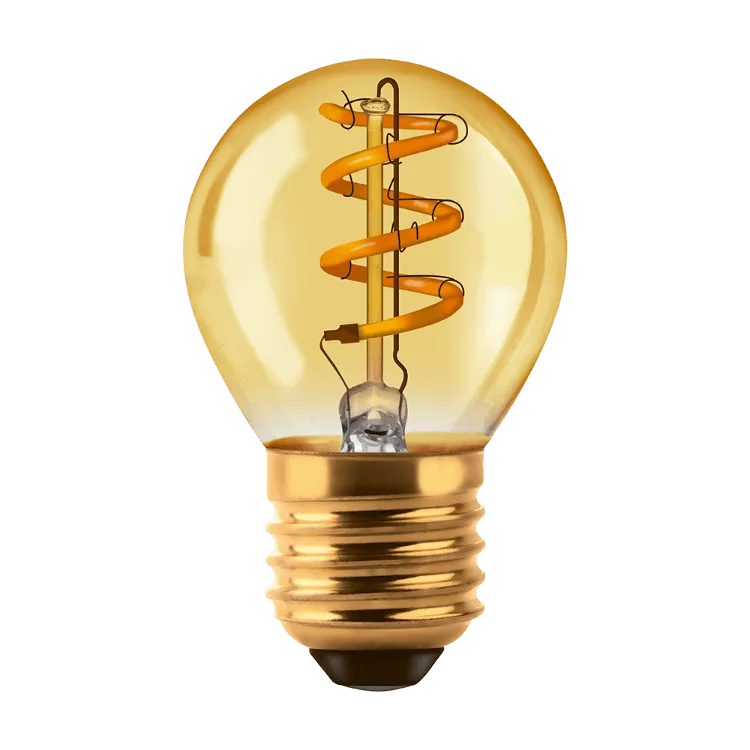 Bulbo gota LED forma G45 de filamento dorado con acabado ámbar en el cristal, simulando una lámpara antigua. Ideales para decoración._x000D_