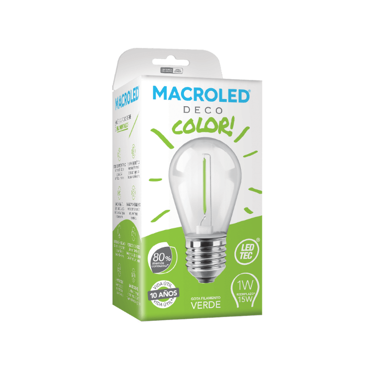 Bulbo gota LED forma S14, de filamento con luz de color verde. Ideal para decoración, iluminación puntual o guirnaldas.