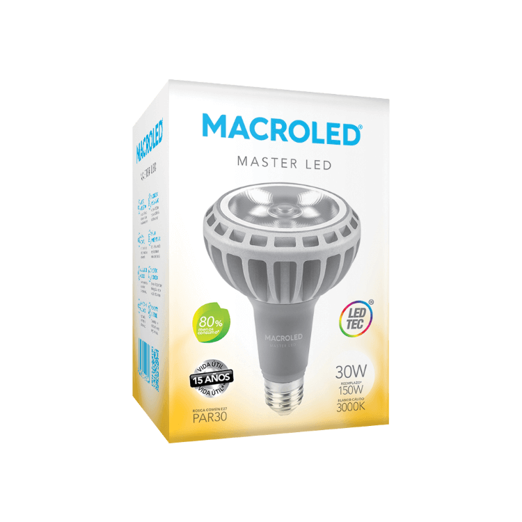 Lámpara Master LED PAR 30, con chip COB led de última tecnología, lente acrílico focal con apertura limitada y disipador de aluminio, que aumenta considerablemente su vida útil.