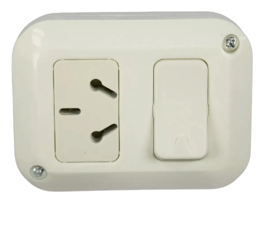 Llave de exterior para sobreponer, con 1 interruptor unipolar y 1 tomacorriente binorma.