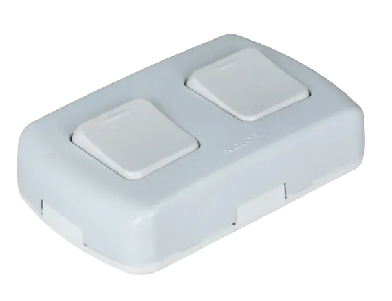 Línea Tekna de Kalop. Permite el encendido y apagado de dos artefactos desde un solo lugar. Facilita también el trabajo a la hora de realizar una instalación con conductos o sistema de canalización a la vista (cablecanal), ya que contiene su módulo de conexión y su respectiva caja contenedora en un mismo conjunto._x000D_