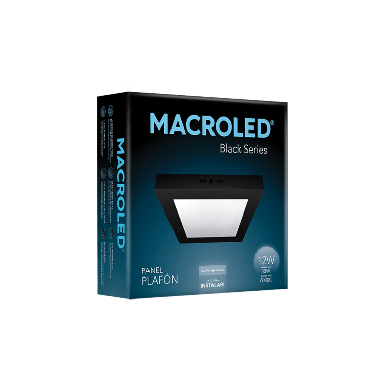 Panel plafón LED cuadrado negro 12W. Sin parpadeos, ecológico y con baja emisión de calor.